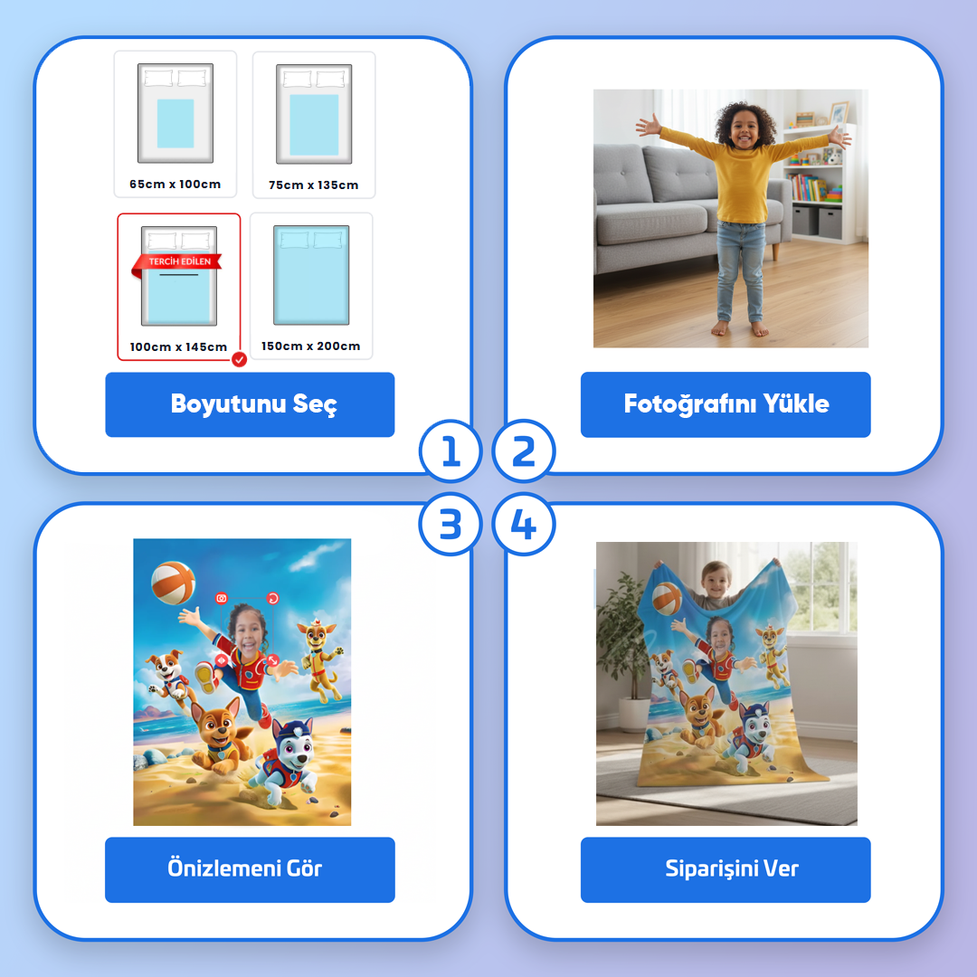 Çocuğunuzun özel olarak hazırlanan battaniyesi; yatak üzerinde, oyun çadırında veya odasında dekoratif bir dokunuş olarak mükemmel durur. Yumuşak dokusuyla rahat bir konfor alanı sunar.